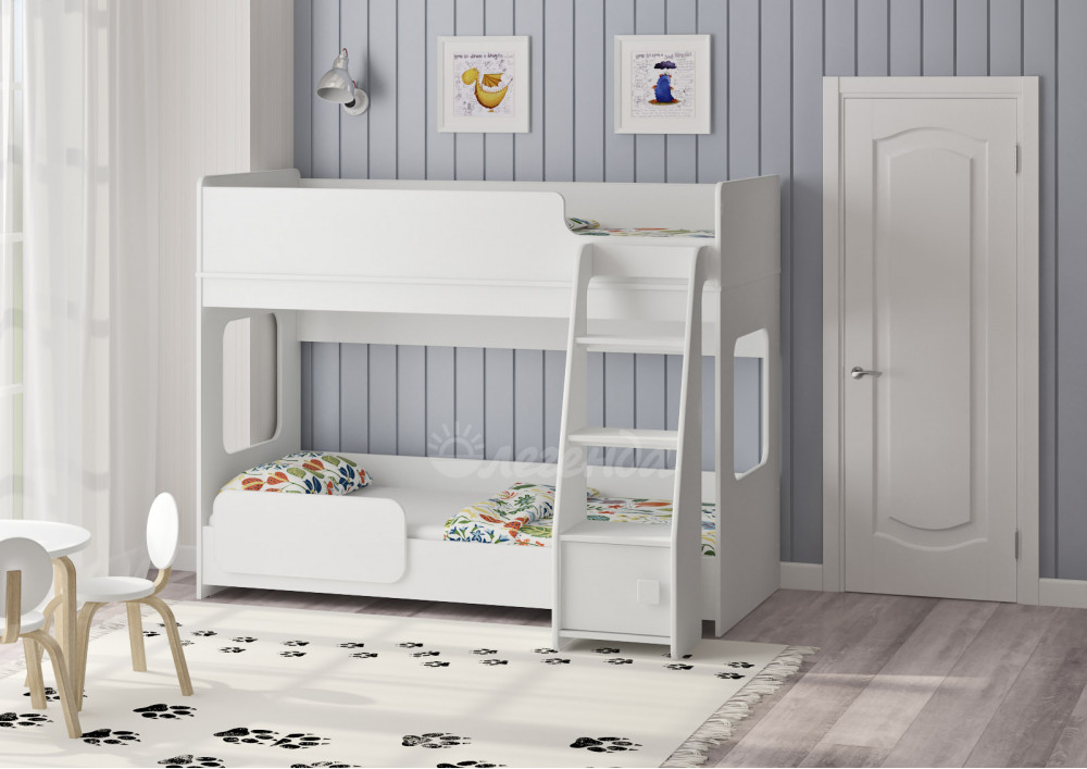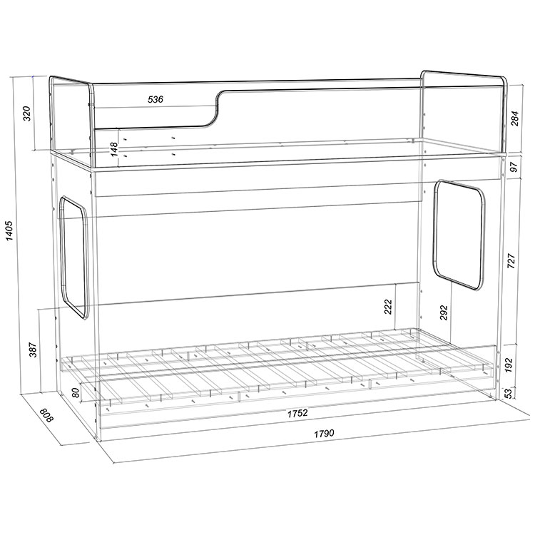 Нижний ярус имеет реечное дно.По вашему желанию нижний ярус кровати можно оснастить бортиком безопасности.